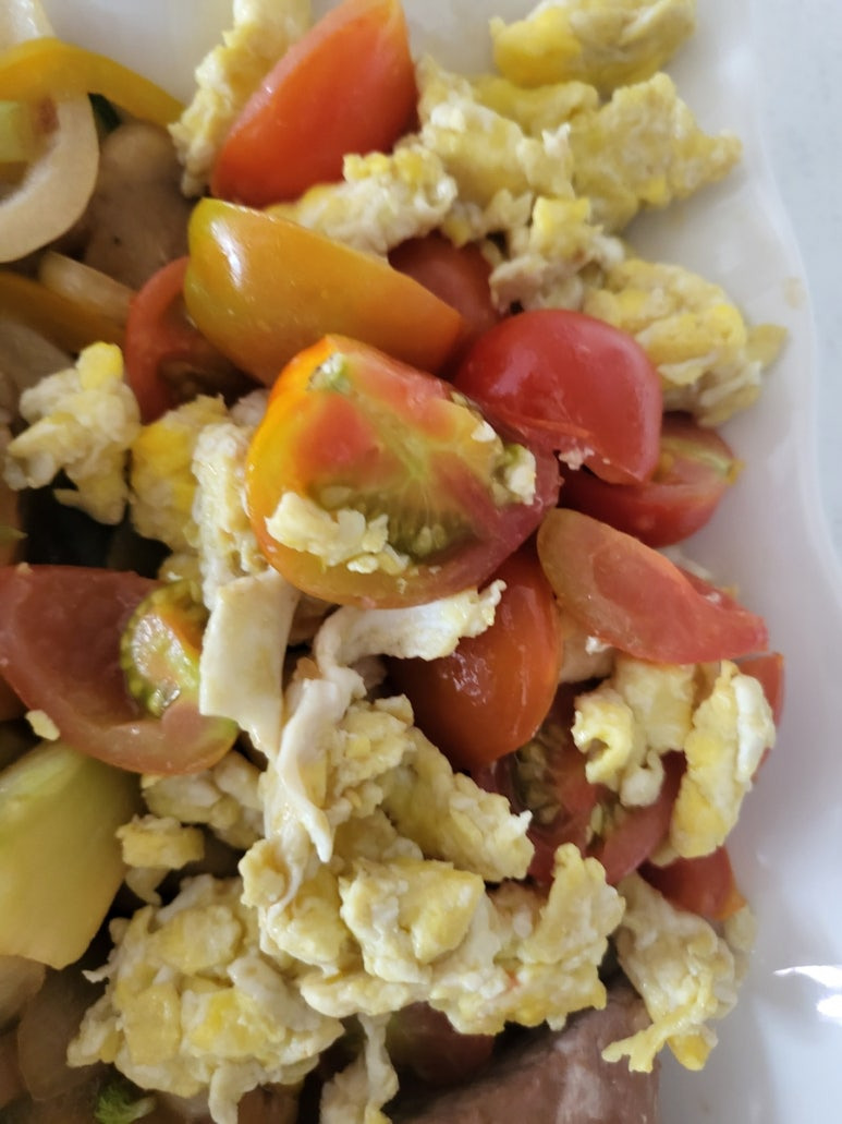 3.볶아준 방울 토마토에 볶아둔 계란을 다시넣고 어개어 잘게부숴주며 살작만 볶아 그릇에 담아준다.