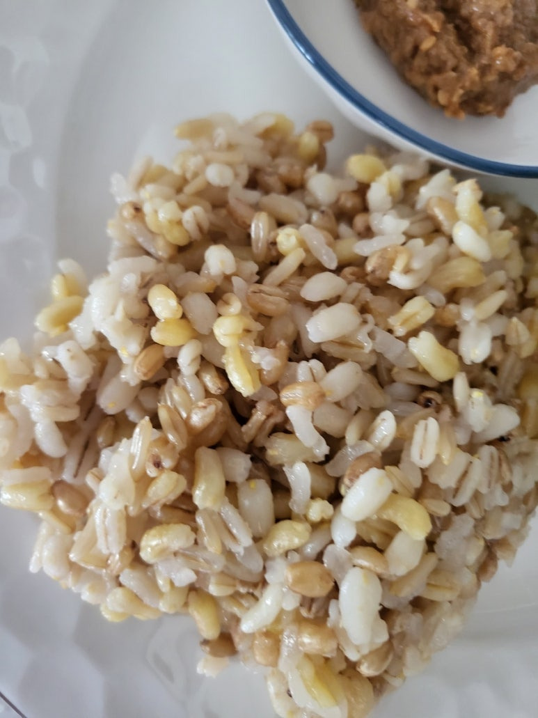 을 위와 같은 비율로 한번 먹을 양으로 소량으로밥을 지어 먹는데 이는 식이섬유가 풍부하고 각종 좋은 성분이 풍부한 영양식나 먹으면서 곱게 부서지지 않으면 흡수율이 떨어지므로 입안에서 진이겨질 수 있도록 꼭꼭 오래 씹어 먹는다.