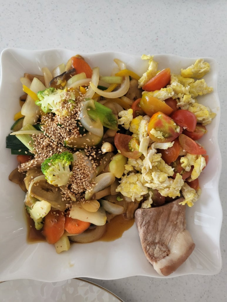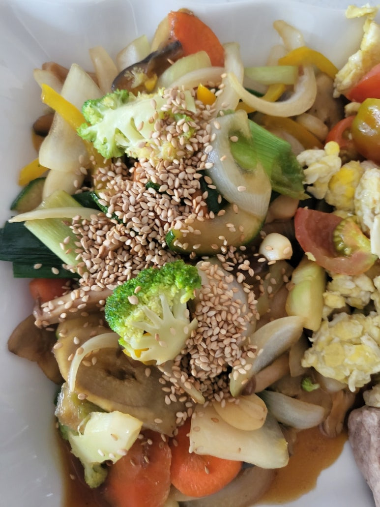 이것을 웍에 올리브오일을 두르고 대파중 하얀부분만을 먼져 넣고 복아주다가 어느정도 익어면 우엉뿌리. 미늘. 대파 잎부분. 가지. 당근. 새송이버섯. 당근. 쥬키니 호박을 넣고 볶아준다. 숨이 죽을때쫌 굴소스를 넣어주고 완전히 익으면 양파. 브로클리. 파프리카를 넣고 살짝만 익혀주어 (양파의 매운맛이 살아있을정도) 그릇에 담아주고 참깨를 뿌려준다.