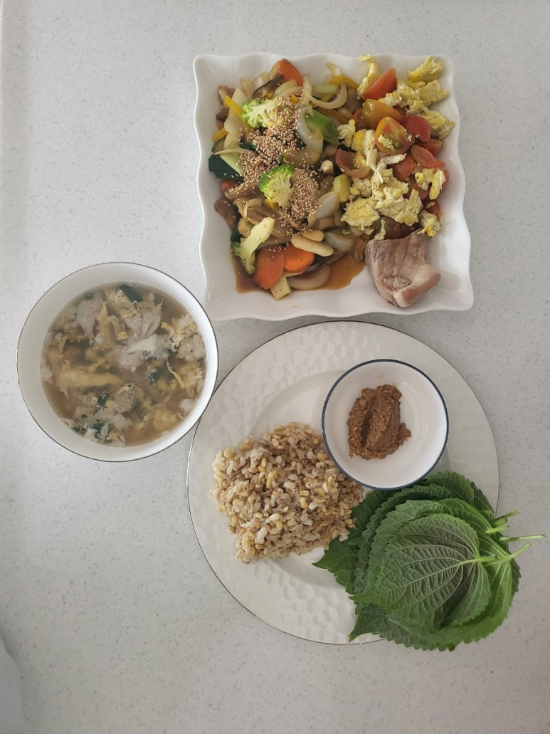 또한 각종 건강보조식품(비타민c. 칼슘. 마그네슘. 비타민d. 아연. 오메가3. 등등) 별도로 섭취하고 나의 경우 덤으로 집에서 내가만든 된장. 간장. 토판천일염 늘보리 고추장은 살아있는 생균을 몸속 장까지 보낼 수 있는 귀중한 균들의 보고이다. 이걸로만든 생쌈장 또한 맛과 영양분이 풍부한 생균덩이리다.